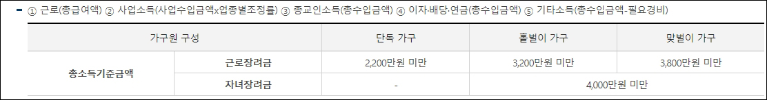 총소득기준금액이며 홀벌이가구 3,200만원 미만 260만원 지급